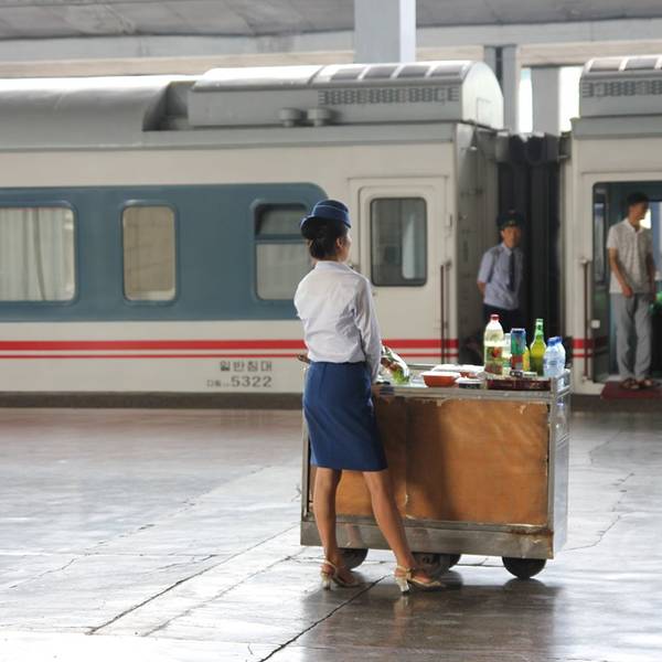 坐火车从丹东到达平壤,一下火车就被火车站的外形吸引了。火车站的建筑外形复古典雅,非常漂亮,很多人下车与火车站合照。到了晚上,火车站附近比较热闹,有一些卖小吃的摊位,不过不准外国团体游客接触。