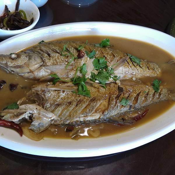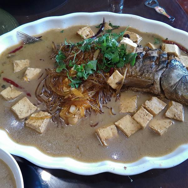 炖白鱼,肉质非常细腻。家常鲤鱼,豆腐很好吃。老板,请问你这样做,真的不会亏本么扎拉诺尔老城区的天意饭店,是当地人吃鱼的地方,各种河鲜的吃法贴在墙上,一目了然。点了呼伦湖的白鱼和家常味道的鲤鱼,加上狗鱼馅的饺子,只恨自己胃太小。