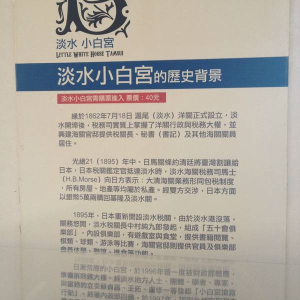 淡江中学旁边有一个叫小白宫的地方,我们在最后一刻进入了,闭馆时间17:30,免费参观淡江中学旁边有一个叫小白宫的地方,我们在最后一刻进入了,闭馆时间17:30,免费参观~~~ 小白宫位于新北市淡水镇真理街15号,属于淡水古迹园区的一部分,淡水是北县拥有最多古迹的地方,在维护古迹中将二十一个古...淡江中学旁边有一个叫小白宫的地方,我们在最后一刻进入了,闭馆时间17:30,免费参观~~~ 小白宫位于新北市淡水镇真理街15号,属于淡水古迹园区的一部分,淡水是北县拥有最多古迹的地方,在维护古迹中将二十一个古迹与一个历史建筑,整合成台湾第一个古迹园区。 展开