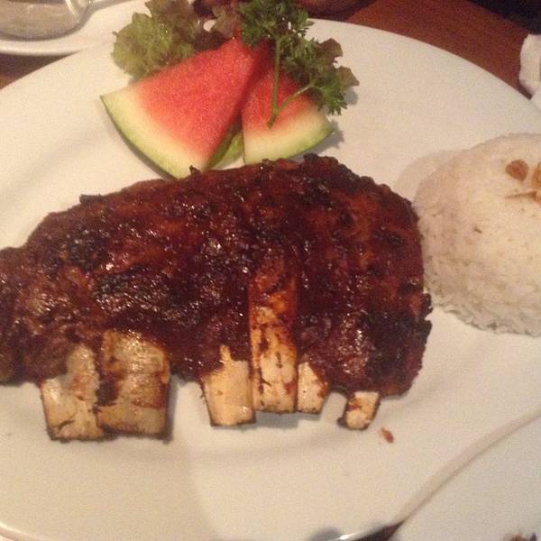 来到巴厘岛一定要吃的就是这家超人气的餐厅,餐厅很小,经常会和其他客人拼桌。这里的风格非常粗犷朴素,感觉所有的标示和装饰都像是生锈似的有点古旧。餐厅最有名的就是烤肋排,一份肋排够2-3人吃,可是配上秘制的调料,让你吃了不过瘾,吃了还想吃。