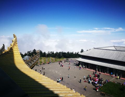 这座寺庙是坐落在峨眉山第二高峰金顶上面,旁边就是华藏寺,这边的建筑比较古朴一点是用比较传统的颜色作为主色调。 整个金顶,其实还是蛮大的。在这座寺庙前面可以静静地观赏一下云海。