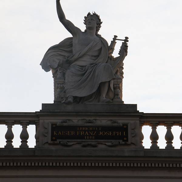 剧院的正面顶部横饰带上方是一尊端坐的阿波罗雕像,两侧分别是缪斯女神墨尔波墨涅和塔丽亚的雕像市政厅马路对面是城堡剧院,也叫宫廷剧院。剧院的正面顶部横饰带上方是一尊端坐的阿波罗雕像,两侧分别是缪斯女神墨尔波墨涅和塔丽亚的雕像。