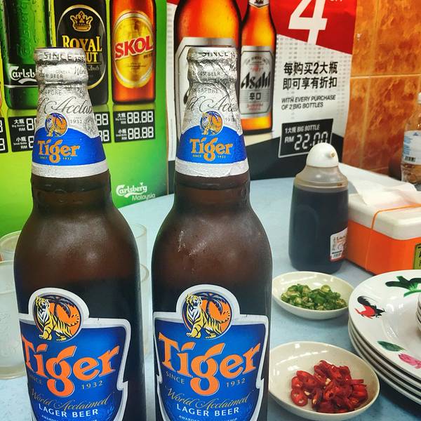 逛完双子塔我们就来到了亚罗街,走到亚罗街尽头,发现黄亚华小吃店没开门,在休整,所以选择了街口的龙记海鲜城。点了一只黑椒蟹,两只龙虾,一份鱿鱼,两份肉骨汤还有一份叉烧,一共328马币 我是剥龙虾和剥螃蟹小能手,所以他们全程都是由我服务的~来马来西亚每顿饭都少不了tiger!