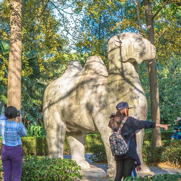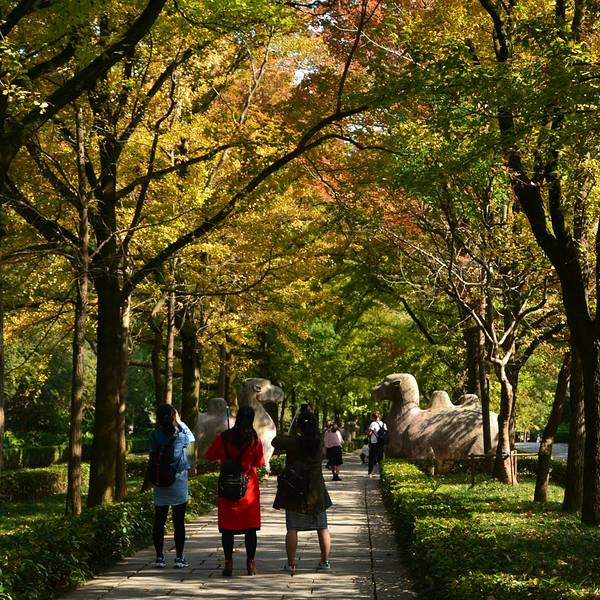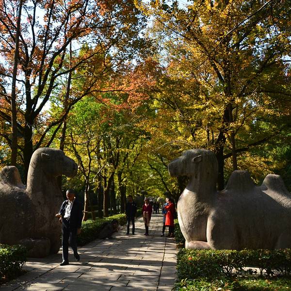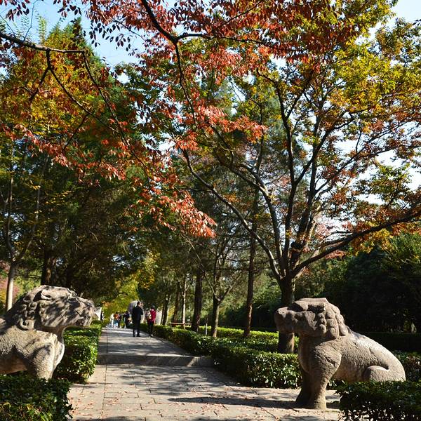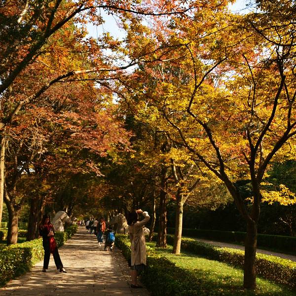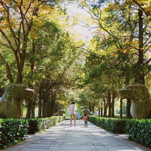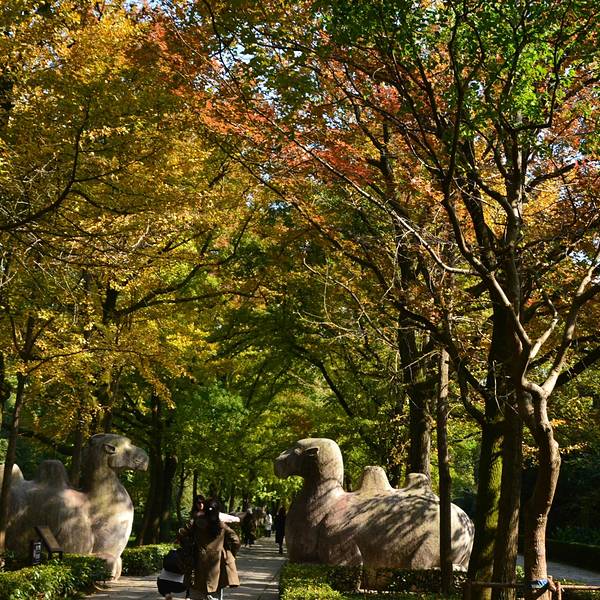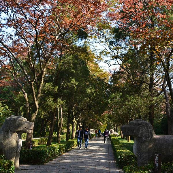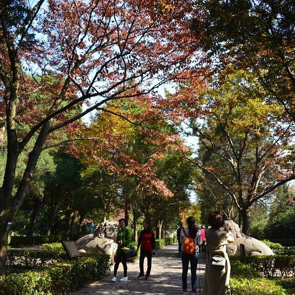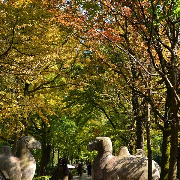 其实秋天来神道参观会更漂亮,那时道路两侧是红色的枫叶,观赏性更强明孝陵另外一个景点就是这里的神道了,神道分为2段,分别是“石像路”与“翁仲路”,在路的两旁对称排列着6种石兽,像护卫一样庄严肃穆,守护着明孝陵。