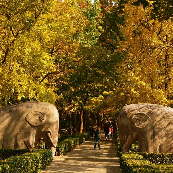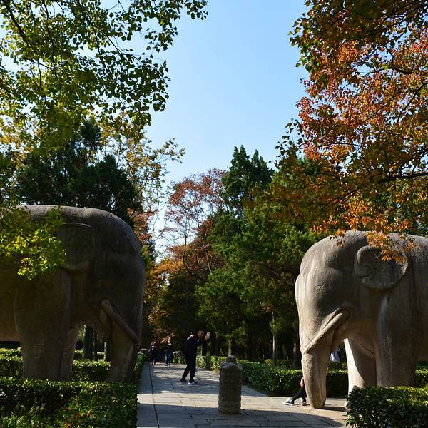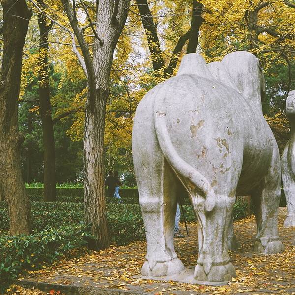 人造道路依地势蜿蜒曲折,据说是朱元璋为了绕开孙权墓故意为之。明孝陵博物馆出来看到这个咖啡馆拐进去明孝陵博物馆出来看到这个咖啡馆拐进去走过梧桐大道看到大金门刷身份证进去,便直接冲着神道去了,期间经过神功圣德碑,俗称四方城。神道600米的一段路,正是明孝陵的精华所在。狮子、骆驼、大象、獬豸、马、麒麟...明孝陵博物馆出来看到这个咖啡馆拐进去走过梧桐大道看到大金门刷身份证进去,便直接冲着神道去了,期间经过神功圣德碑,俗称四方城。神道600米的一段路,正是明孝陵的精华所在。狮子、骆驼、大象、獬豸、马、麒麟等6种动物石像或跪或立,很难想象当初是怎么运上山来的。现在还没到枫叶红的季节,狭窄道路两边主要是金色的银杏叶,从大金门到梅花山南路口这一段树叶红的黄的最好看,下一段便一般了。