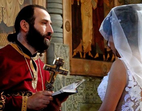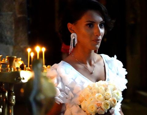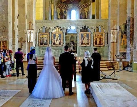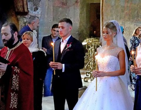 生命之柱大教堂的由来,据介绍,当时国王对教堂的设计十分满意,甚至为了不让设计师再有超过这座教堂的作品,因而砍掉了设计师的右手,在教堂侧面墙壁上刻有设计者的右臂浮雕,以示纪念。似乎每个举世无双的杰作都有一段不堪回首的血泪史。教堂的外观,庄严肃穆,里面更是让人赞叹不已,历经数百年的时光,周围的壁画和墙上的雕塑,在顶楼窗棂阳光穿透下来的照耀下,熠熠生辉。正好赶上一对新人举行仪式,新郎新娘、伴郎伴娘手握蜡烛,认真聆听着神父如歌唱般的喃喃细语,满满的亲朋祝福,很热闹,但又莫名的宁静。外高加索的姑娘很美,再配上这新郎新娘礼服,整个场景就像是从油画中走出来一般,新娘就好像芭比娃娃一样美丽漂亮。生命之柱大教堂不愧为姆茨赫塔古城的璀璨瑰宝。