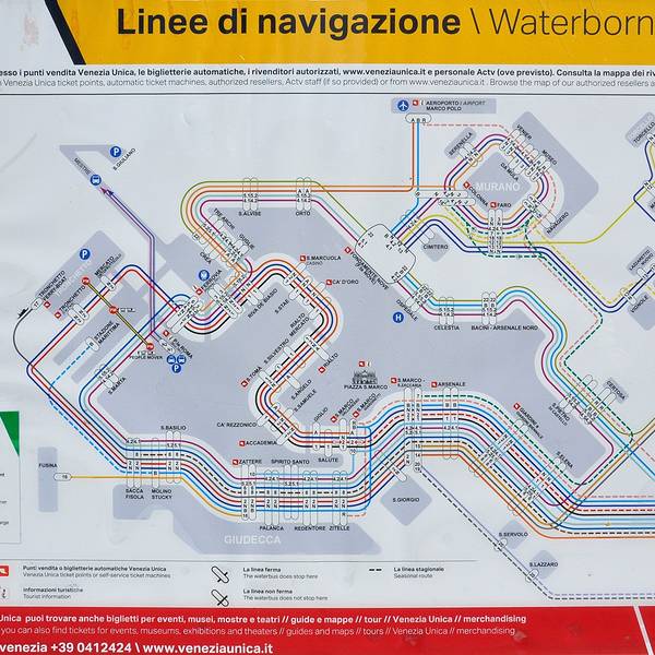 水上巴士是威尼斯的主要公共交通工具比较主要的船有1号、4.1、4.2、12号船等,船身有醒目标识,水上巴士的码头一般左右两边是不同的方向,各有线路图标,看清楚是不会坐错的。每个码头上都有刷票机,上船前记得刷票,通票在第一次使用的时候刷票开始计时。