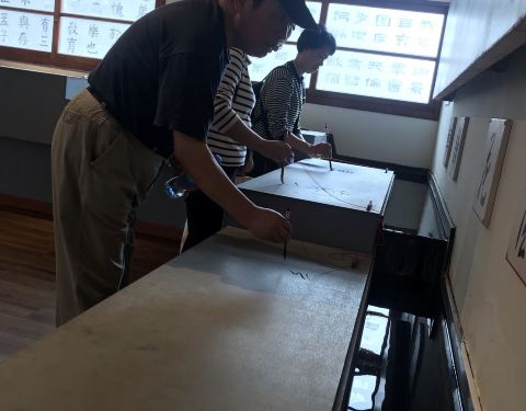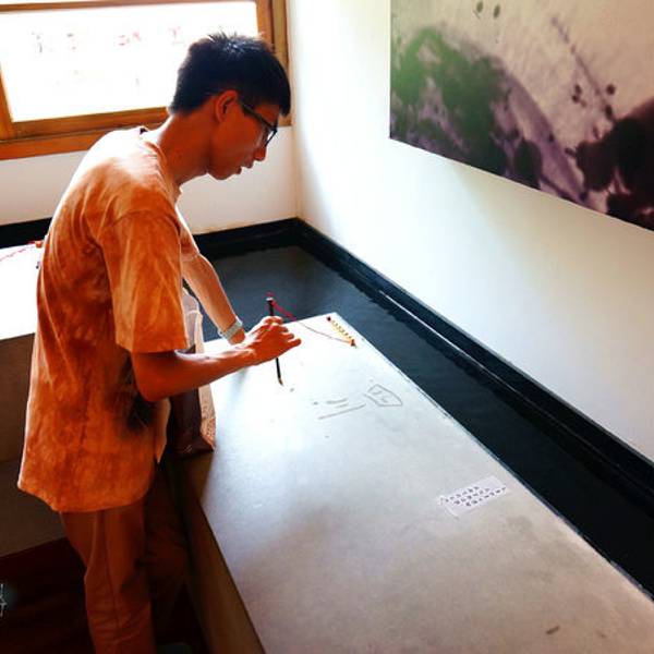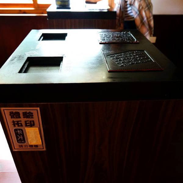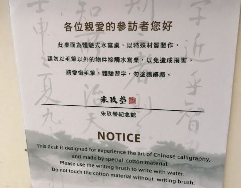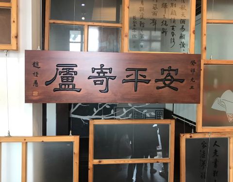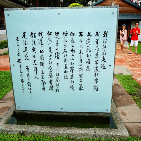 一旁还是慢悠悠游览的人们,喵神极力推荐有时间的朋友们,可以租辆自行车好好逛逛这一带。这是拓印的体验台德记洋行的隔壁即朱玖莹故居,和树屋、洋行一样在一个园区,故居内陈列了许多朱玖莹的书法作品。门口首先就是朱先生的墨宝——郑愁予的《错误》。