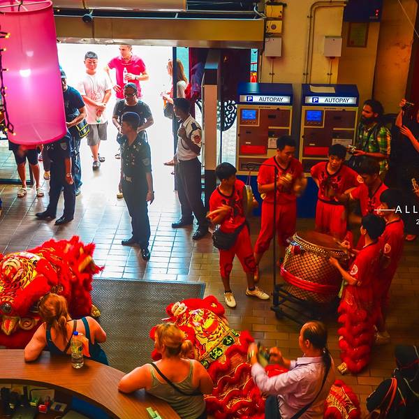 经过中央艺术坊,禁不止冷气的诱惑,四个人一溜烟钻了进来。门口正好赶上舞狮表演。