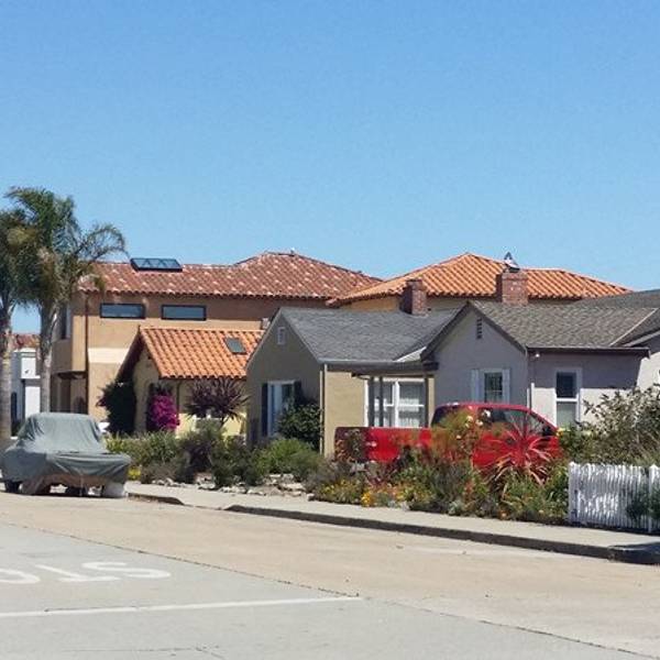 风大、阴冷,给少爷冻得够呛。继续上车前往计划中下一个地点:圣克鲁兹海滩。 “圣克鲁兹海滩是西海岸最美丽的海滩之一,它是冲浪和沙滩排球爱好者的圣地。延绵的沙子和蔚蓝的天空和大海带给人浪漫悠闲的感觉。黄昏时候,海滩上美丽的落日映红了天空与海洋。” 圣克鲁兹海滩位于圣克鲁兹小镇,是1号公路的一个必经之地。不过好像特意停留来玩的人也不多。到了小镇,浓雾散去,阳光高照,把车开到海边的一处马路边停下,步行前往。 家家户户都是这样的小平房,门前的院子里种满了大大的多肉!大的闪瞎我的眼。