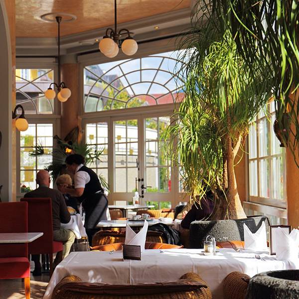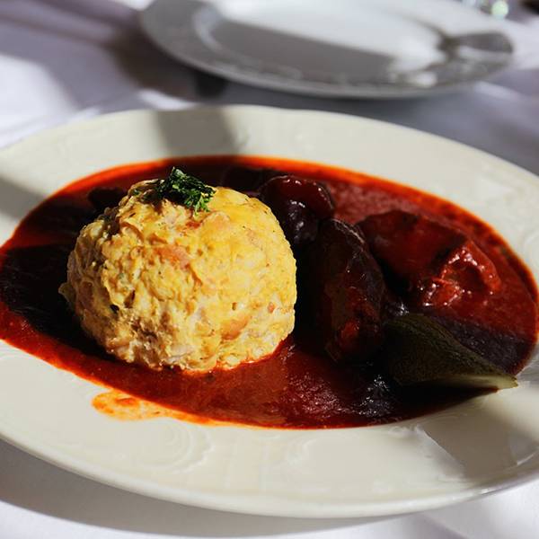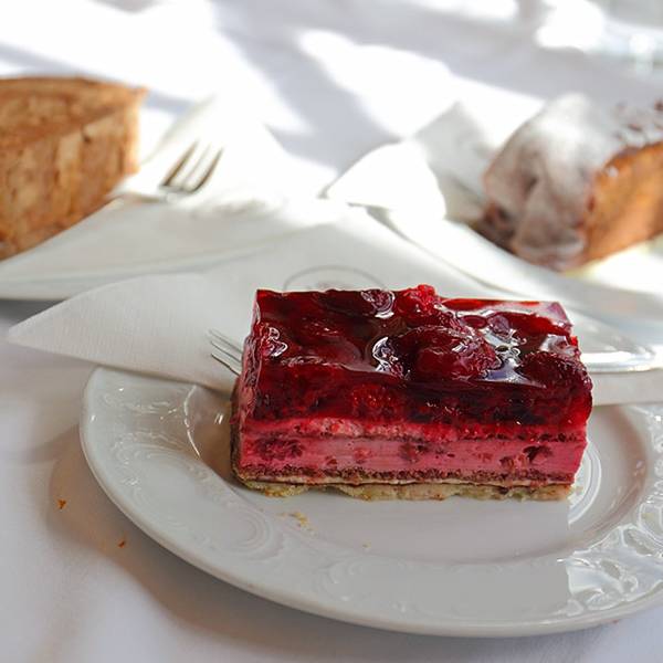 巴德伊舍进城的地方有个很大的地下停车场,我们把车停在这里,然后步行去著名的皇家甜品店泽纳。泽纳是弗朗茨·约瑟夫最喜欢的甜品店。巴德伊舍有两家泽纳,相距不远。一家在城里的Pfarrgasse路,叫泽纳甜品店Konditorei Zauner,这家以外卖为主;另一家在河边的Esplanade路,叫泽纳咖啡馆Grand-Café & Restaurant Zauner。我们去河边的这家吃午饭。 在门口等了好一会儿都没人来引座。我找了一个服务员问有没有座位,她看着店里N多的空座似乎觉得这问题很奇怪,往里一指告诉我随便坐。我心里对这服务质量有点嘀咕,后来才知道奥地利捷克的咖啡馆基本都是这个程序:自己进去找座,然后到甜品柜台点甜品,服务员会给你一张纸条,到座位上点饮料,把纸条交给服务员,过一会儿饮料和甜品就会一起送来。