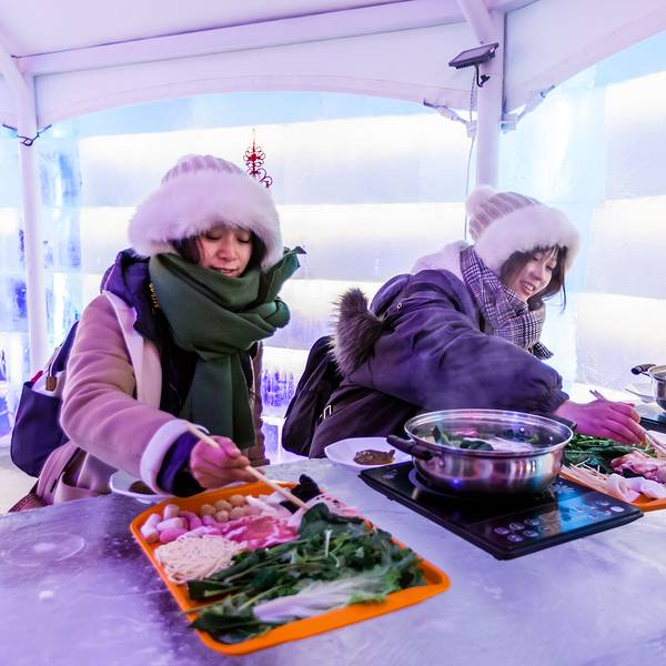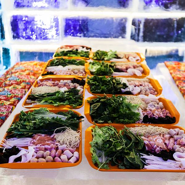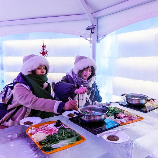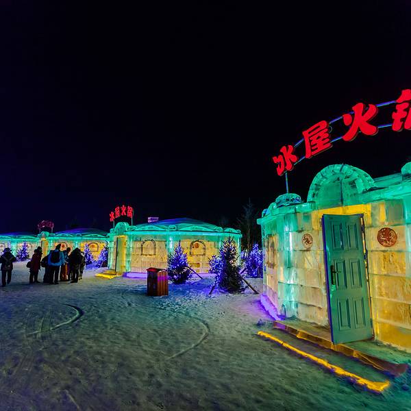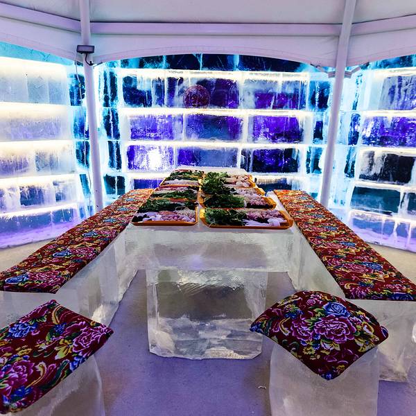 即使这么冷,在白天体验了一系列热烈的项目后,想不到晚上还有更精彩的等着我们。我作为一个北方长大的孩子,如今在城市里雪还是越来越陌生,到冰雪世界里寻雪找雪的欢乐,居然仍旧会惊喜不断,每个大人在雪世界里也找回了童心未泯,冰屋里吃火锅,雪地里燃起篝火,唱着歌跳着舞多欢乐,晚上还可以住在河畔别墅的小木屋,映着窗外的白雪、红灯笼,睡在炕上,嗑着瓜子喝着茶水唠着嗑。呼兰河口冰屋火锅这个创意好啊,在如水晶的冰房子里,吃着热气腾腾的火锅,四周是用冰块堆砌而成,就连桌子,凳子都是冰的,只是冰凳上有着东北特色的大红花色坐垫隔凉,冰墙上也贴上了东北的剪纸,贼有东北这噶哒的感脚啊。在冰屋里吃火锅,我们不担心冰屋会化,我们担心端过来的菜稍迟疑,就撅不开夹不起,冻上了。