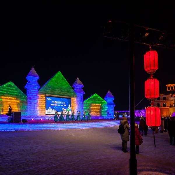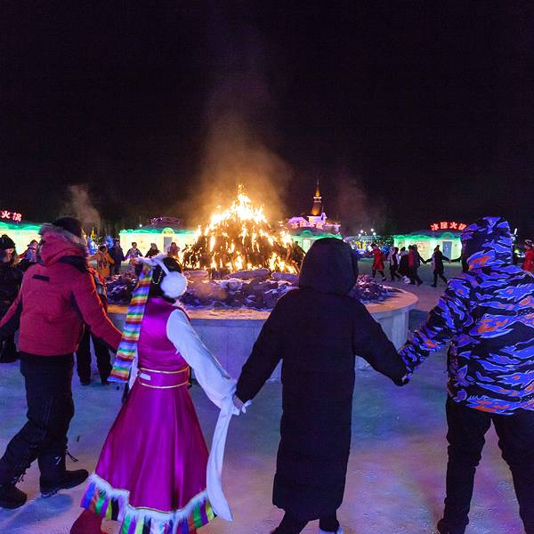 所以这个火锅需要综合技能,既要坐在冰凳上有抗寒能力,又要眼疾手快把生肉生菜迅速夹起放到火锅里,熟了之后放在自己碟子里也要迅速地消灭,不然即使没来得及冻上,也会凉了还得在火锅里再热一次,但吃的却是格外的香,有成都女孩儿的认真的吃为证,吃一会冰屋里就会雾气腾腾,氛围就又上来了,能见度只限看清你对面和旁边的人,别看了,最重要的是抓紧吃。吃完火锅,身子暧了,意犹未尽,走到冰屋外面的雪地里,篝火晚会开始了,冰做的背景,冰做的舞台,冰天雪地燃起熊熊篝火,搓着手跺着脚烤着火听着歌,贼啦啦的过瘾。雪地篝火晚会还是带着东北特色,舞蹈跳起来欢快祥和,氛围顿时来了,在这冰火两重天的欢乐里,小伙伴说,这接地气儿的感觉蛮有过年的气氛啊。