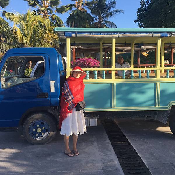 在这里,吃饱喝足,真的很想睡觉,秦看下面的这只狗狗。。。吃好了,我们就又往三联滩方向骑去,那个方向的路有一段上坡蛮陡的,哈哈哈,刚好吃完消化一下果然这里是最美的沙滩的,我们也不清楚这是不是三联滩,我怎么觉得比德阿让沙滩更美呢,沙子更软,海更清澈,风也很大,阳光更舒服啊这个好像是环岛的观光旅游车,没有坐过,也不清楚价格,但是我觉得颜色很漂亮17:45 回去咯,我们买的都是往返票,四点的回去的票没有买到,就只有买这班船了,这是最后一班船哦,大家记住不要玩过,忘记时间。 展开
