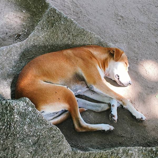 北边地势较高,马路边就是大块大块的岩石,被冲刷得干干净净,残留着几个退潮时没来得及撤退的生物。跳岛游的小艇从这片海域划过,之后又只剩下海浪声。找一块凹陷的岩石,手脚并用爬上去,舒舒服服躺下……玩手机。越往北地势越高,翻过最高的那个角,陡然下降,马路到这里就到头啦!再往前,就只剩下细碎的沙石地面,自行车原地罢工。