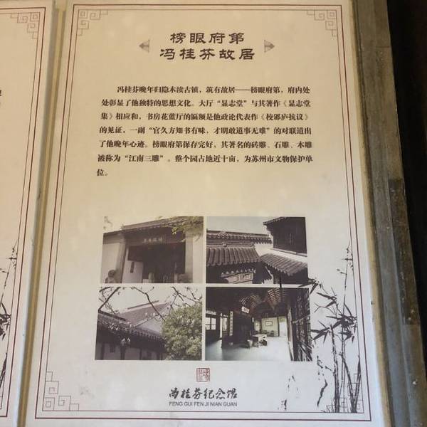 江南园林特色,建筑结构精妙,厅室交错,辗转回廊,屋中有天井,一进屋后又有花园小径、小桥流水鱼塘...位于苏州木渎古镇的清朝年间的榜眼冯桂芬的府第,规模较大的私宅,占地十亩。冯桂芬与林则徐是师生关系,也曾做过曾国藩及李鸿章的幕僚,提倡“中学为本,西学为用。”高大的厅堂尽显主人非凡气度。整座宅邸室内...位于苏州木渎古镇的清朝年间的榜眼冯桂芬的府第,规模较大的私宅,占地十亩。冯桂芬与林则徐是师生关系,也曾做过曾国藩及李鸿章的幕僚,提倡“中学为本,西学为用。”高大的厅堂尽显主人非凡气度。整座宅邸室内面积也很大,江南园林特色,建筑结构精妙,厅室交错,辗转回廊,屋中有天井,一进屋后又有花园小径、小桥流水鱼塘,亦宅亦园。状元府邸现在除了展览冯桂芬生平事迹,还有画家周士心的常年画展,都很不错。值得一游。 展开
