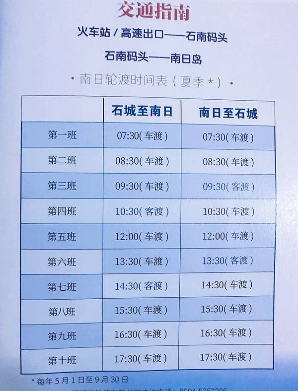 下面是轮渡航班时刻表,各位游客可以根据时间安排好行程: