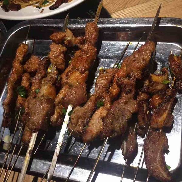 听说他们把宜宾八中那边小烧烤烤得最好的师傅挖来了。所以味道上真的不用担心。猪鼻筋撒上孜然和辣椒,相比牛鼻筋柔嫩很多,有嚼劲却丝毫不费力;花心是截取猪舌头根部的脆骨部分,所以非常脆嫩。着重推荐的是生牛肉。一只牛最多有4斤可以做成这道菜,选用黄牛肉里脊最嫩的部位,薄薄的牛肉片抹了一层巡海椒,在上面铺上一层香菜,配着芥末酱吃,极嫩冰凉的肉质加上芥末,刺激,通透,爽!饭后来一碗来自双河古镇葡萄井水浸制而成的凉糕,红糖绝不粘稠,甜而不腻,凉糕粘糯,是减轻肠胃负担的好帮手。