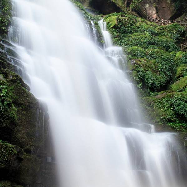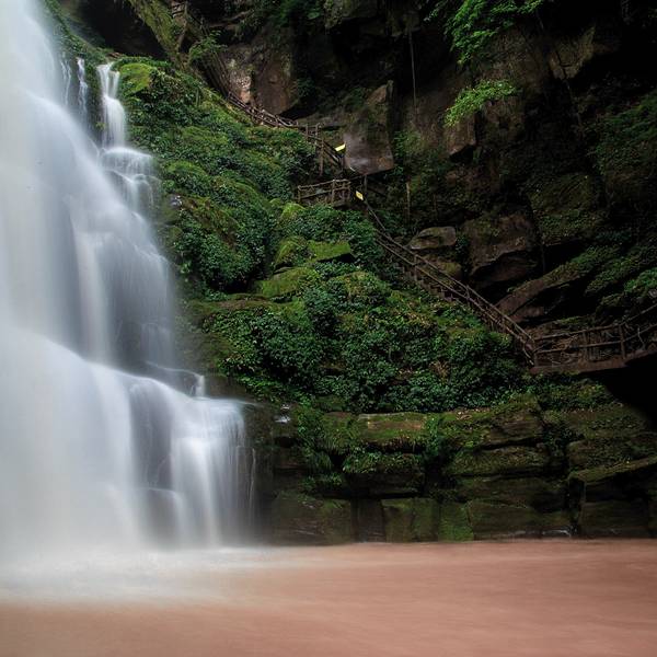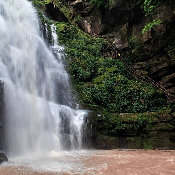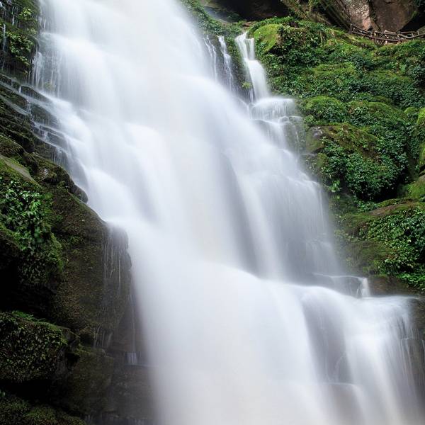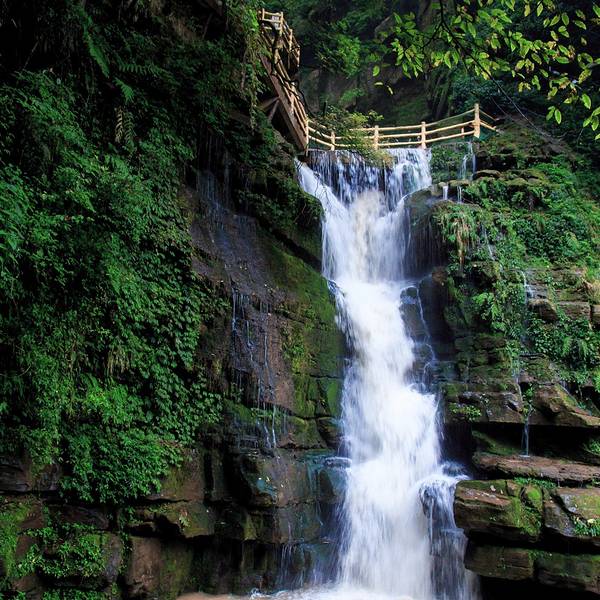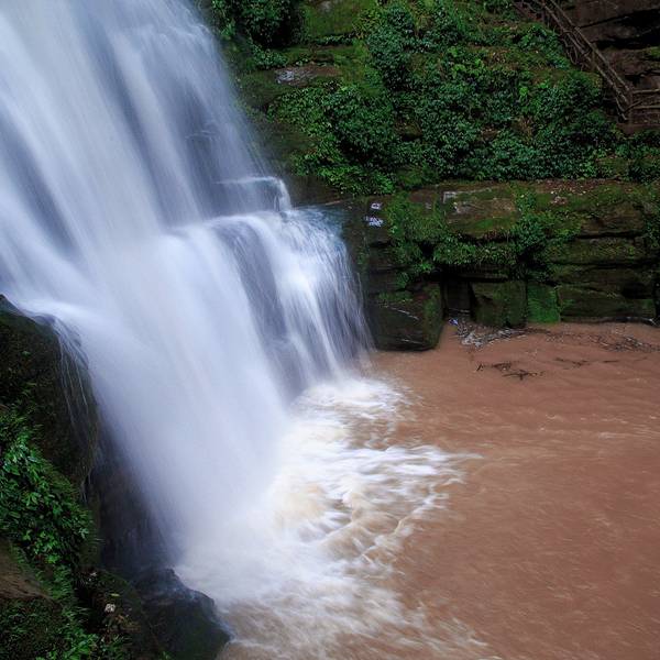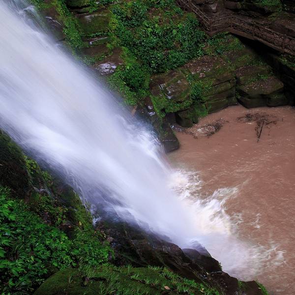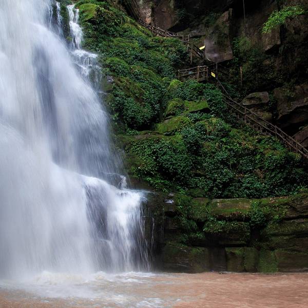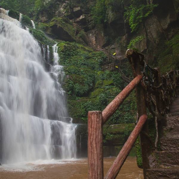女娲池银瀑高悬,位于景区白龙潭瀑布下,为瀑布多年冲刷而形成的开阔潭池,碧水平铺。
