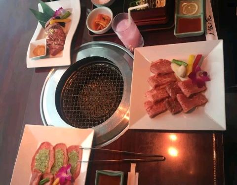 ❤位置❤ 因为直接在DP收藏了,就直接跟着定位走了..走到了发现不对... 在路上遇到了一对日本夫妇,带我们去了..还问我们是哪里来的,我说上海,对方说他们暑假就要搬去上海,有缘人。 so,所以按照定位走,要绕大厦一圈,绕到商场,然后到8楼。 ❤服务❤ 到店11点,已经要等位了,不过还好就等了20几分钟。双人位依旧和其他店一样是并排靠窗,走路有点吃力。烤肉是要自己烤的,服务员是基本看不到的..需要按铃...当然换盘子也是不会主动的..中午和晚上弹钢琴的妹纸是不一样的.. ❤菜品❤ 尽管没有什么服务,口感依旧是满分。 力推的是烧烤格纹牛肩脊肉、和牛拼盘 慎选的是葱花牛舌..葱花是真的很实在,不过我不喜欢.. 午市会有一些套餐,价格很便宜,口感也是意外的好吃,可以尝试。 套餐里会送软饮或者朝日啤酒,软饮是粉色的可尔必思。 餐后买单以后会有小甜品
