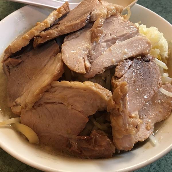 第五名:东京二郎拉面 也是一个连锁店,我只能说我这次算是开眼了,我还真没见过在日本有量这么大的拉面…我还点了个大份的,上面的肉片特别厚,盖了整整一层,别人家的面条一筷子都能挑起来,他家的面条,你要是一筷子只能把肉都撒出来~我在日本这么多天终于算是吃撑了一回竟然还剩下了,MOMO 那份要的是正常的,只是觉得吃到后来实在不想吃那大肉片了,太腻了… 从味道上来说,算不上美味吧,有点咸,跟之前的那几家比还是略差了一些,也主要是突出了一个量大,来这里吃的大部分是学生和社会下层百姓~