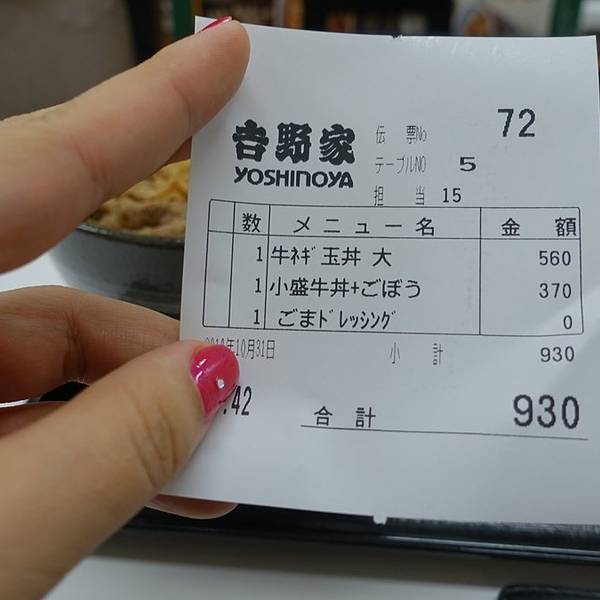 第一顿去了[吉野家],呵呵,北京经常吃到,想看看在日本味道会有什么不同。首先吉野家在日本基本都是回转式,有点想咱们的回转寿司,价格跟北京也差不多。。味道也很接近,最爱的一点是他们的辣椒粉,不辣但是很香,太爱了以至于吃了很多。。 2个套餐:930円,50元左右吧。
