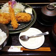 是日本非常有名的猪排店。或许因为原料不同,和上海伊势丹里的看起来完全不同,肥美多了。点了御膳用的猪排。上来这米饭不知道怎么形容口感,就是略有不同,很好吃。猪排表皮松脆,肉质滑嫩,咬一口就有满满的幸福感。洋白菜丝,切得均匀细致,原生态的甜脆。此外,白饭、卷心菜和味增汤是可以任意添加的,喜欢吃的可以自由享受哦。浇上最特别的配角,猪排酱配猪排,虾酱配炸虾,芝麻沙拉酱配卷心菜,此外还有辣酱、日式酱油,这一顿太满足了。
