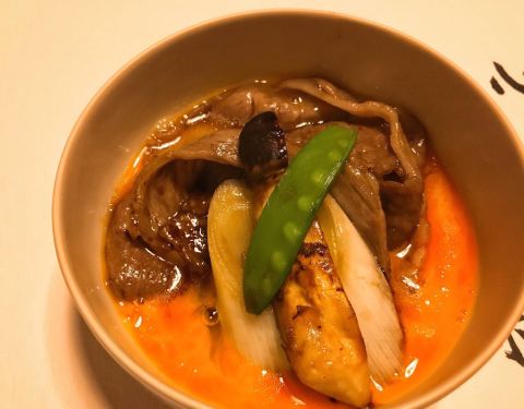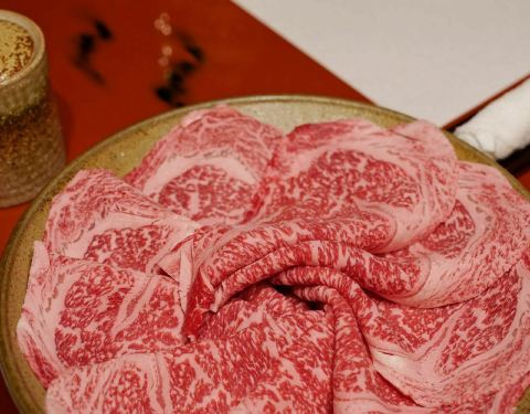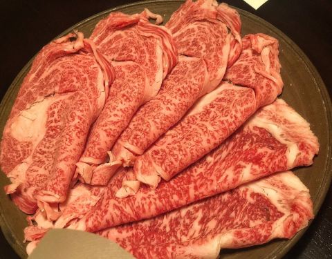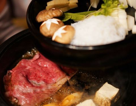 前菜端上来就被惊艳到了 虽然都是小小份但从摆盘到口感都十分精致。 绵绵的豆泥拌上清甜的茄子泥 清爽又美好。秋葵拌的是黑芝麻酱的 这是怎么想出来的太香了!香菇的口感肥厚又脆嫩 醋渍也很开胃。小芋艿又滑又糯 一点点盐调味就绝了!地瓜也是甜到心坎里。 仅仅是前菜足以见证食材的用心 这让人更加期待主角寿喜烧的登场。 穿和服的老奶奶端来一锅蔬菜 一盘鸡蛋和一大盘北海道和牛。每片都太大太实在了 堪比脸大毫不夸张 而且超级厚 雪花纹路均匀分布。一盘生肉看得人心花怒放 一人三片和牛 分三次烧。 第一烧会比较清淡 更能尝出肉的鲜美。第二第三烧会更入味 酱汁的香甜味道会更浓郁! 层层递进的味觉体验 而且每一烧都会精心搭配不同的蔬菜。一顿下来虽然全是一个做法 但一点都不无聊。 北海道A5和牛的口感不用多说 脑补一下都知道有多柔嫩 蛋液一裹就直接滑进嘴里 脂肪的香味弥漫开来 豆腐 魔芋丝 荷兰豆 大葱 香菇 全都不输牛肉的好吃程度。除了洋葱可以再糯一点 根本挑不出任何毛病。