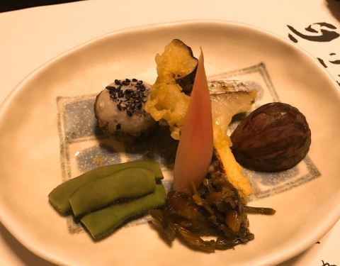 前菜端上来就被惊艳到了 虽然都是小小份但从摆盘到口感都十分精致。 绵绵的豆泥拌上清甜的茄子泥 清爽又美好。秋葵拌的是黑芝麻酱的 这是怎么想出来的太香了!香菇的口感肥厚又脆嫩 醋渍也很开胃。小芋艿又滑又糯...