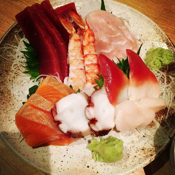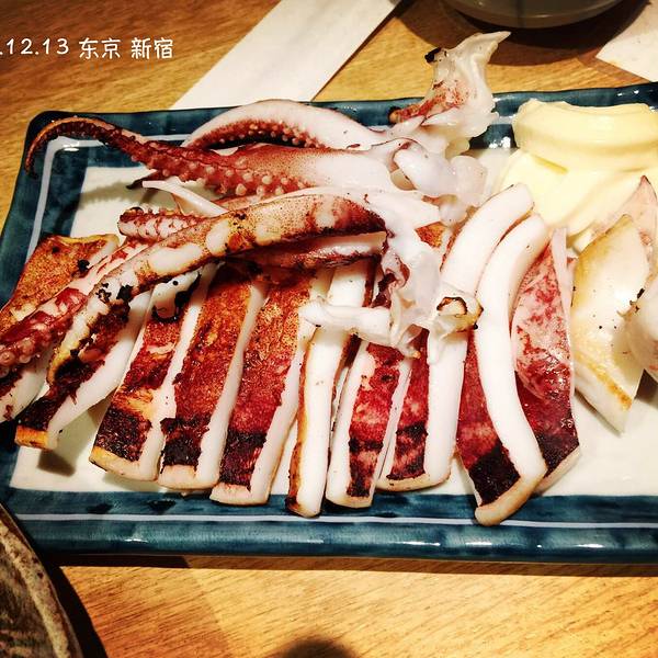 饿了一整天,回到新宿随意进了一家小店,里面很多人,旁边一桌似乎是某个公司里的同事聚餐,热闹的很。 和顾先生一起点了小菜毛豆、寿司拼盘、烤鱿鱼、刺生拼盘。以为和国内一样小小的量,没想到失算了,全部都是满满的一大份,寿司的个头顶中国版的2个那么大。 味道没有什么特别,其实日式料理无非就是新鲜两个字,实在是新鲜到不行!特别是那盘烤鱿鱼,至今回想起来也都是口水~~
