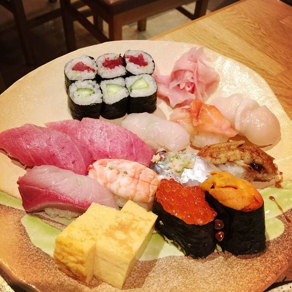 和顾先生一起点了小菜毛豆、寿司拼盘、烤鱿鱼、刺生拼盘。以为和国内一样小小的量,没想到失算了,全部都是满满的一大份,寿司的个头顶中国版的2个那么大。
