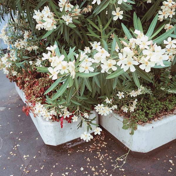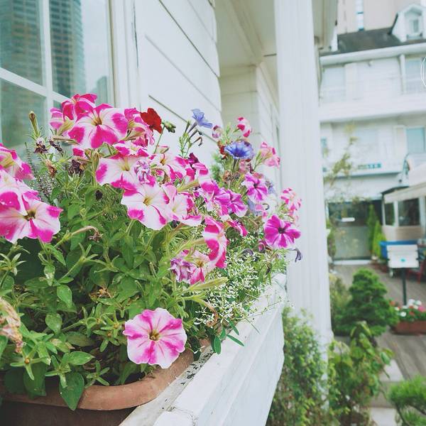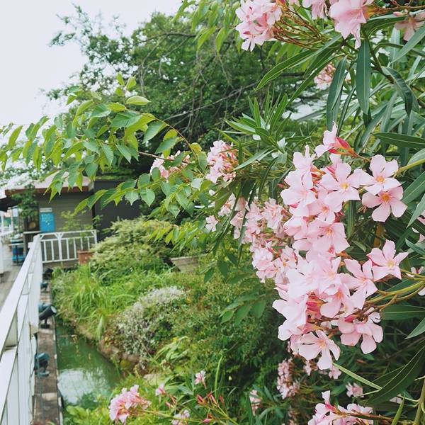 不紧不慢地走到了神乐坂下,这里有我要找的一家意大利餐厅:canal cafe。餐厅就在神乐坂下的马路对面。 看着如此洋气的一家西餐厅,已经营业近百年,挺意外。沿着河岸搭建的餐厅充满了浪漫的气氛,而店里最有魅力的位置莫过于水边木色栈桥所架成的露天甲板区。《拝啓、父上樣》在这儿取了不少景,第一集第一幕中夜色下的河岸就是这儿。剧中的一平在这儿和五郎大叔在这儿聊天。午餐点了人气主食茄子意大利面还有一种西式馅饼。这家意大利面和我以前吃过的都不一样,扁平的面体更容易入口,番茄汁包裹下的茄子居然和意大利面这么搭,是我意想不到的。忘记了具体名字的馅饼非常好吃,搭配着我点的樱花味儿冰饮,吃着特别舒服。电车在河对岸的绿林之间穿梭而过,小雨时有时无。面对着开阔的河岸吃吃喝喝,生活赋予的美好迸发出让人心绪平和的力量。鉴于这家餐厅的view实在是棒,我们待了好久。吃完饭喝个咖啡,望着河面发发呆,逗逗水里的大鲤鱼,随意走走看看,这是一个完美的午后。旅行的乐趣在于,总有未知的小景致在等着你。 这路边的一丛花儿,极其浓密。有刚形成花骨朵儿的,有正在恣意绽放的,更有零落于花坛之下的。在生命的分子核心,花与人是相同的啊!吃完午饭,继续回到神乐坂的街道上。别看这儿的小街道还挺热闹,只要你随意往一条巷子一拐,就可以找到与主街完全不同的宁静。这里的小巷颇有京都的味道。路边有一家非常好看的花店遇到放学回家的日本低年级小学生,一边聊天一边走路,特别可爱。日本放学挺早的,下午两三点就可以看到回家的小学生了。日本人特别注重培养小孩的自理能力,所以上学放学都是小孩子自己背书包拎东西。在我心中,神乐坂是东京最美的一段坡道,没有之一。谁能想到,这处处透露着昭和旧风情的街道竟然就位于热闹繁华的新宿区呢?