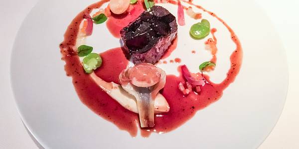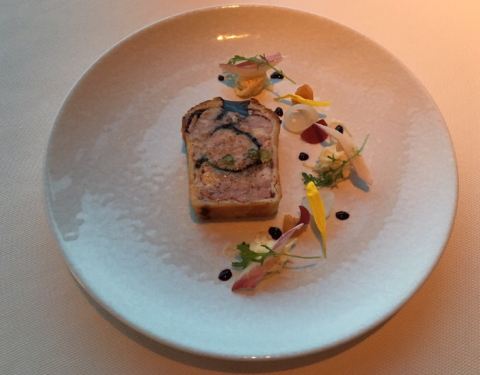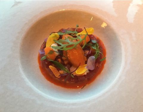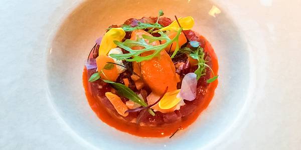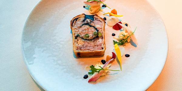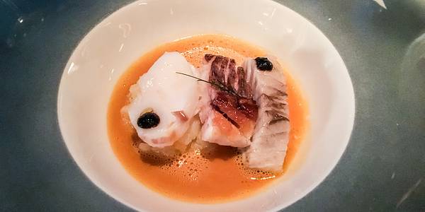 薄切鲈鱼配贝类与黄瓜佐鱼子酱