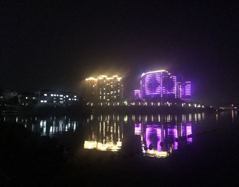 沿台阶向下一直可走到湖边,平静的湖面倒映出高大建筑闪烁变幻的多彩灯光,赏心悦目