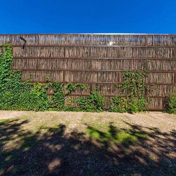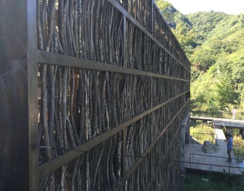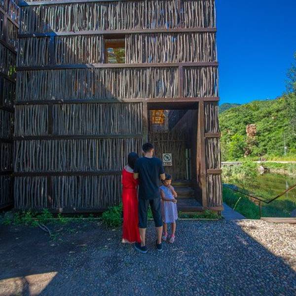 “篱苑书屋”坐落在北京怀柔风景秀丽的交界河村东南山水交汇处的智慧谷,占地170多平方米,总投资160余万元。依山傍水,钢架结构,全玻璃外窗,在玻璃窗外又用几万根的柴火棒环绕,既可以透光,也避免强光的暴晒。