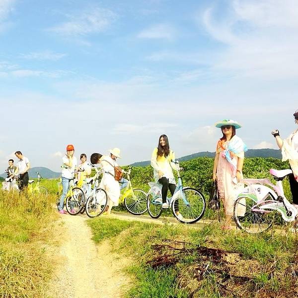 下午三点半...计划中,我们第一天下午安排是骑行环岛游,先去岛西边的“草原”和红树林,然后再骑到东边的鸡冠礁。天气虽然时有阴沉,但太阳还是很晒的,大家做好全副武装,骑上自行车,开始真正的海门岛之旅了。