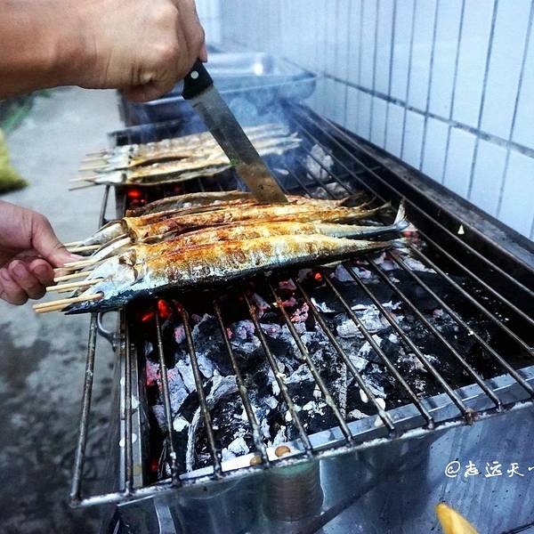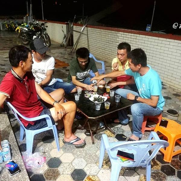 没过多久,就听到大家喊着快来吃烧烤咯。原来,老谢的两个烧烤炉已经步入正轨了,一串串香气扑鼻的烧烤,正源源不断地送到餐桌上,被大家一抢而光。门口两桶冰镇的啤酒,也被几位男生不断开启。在这酷热的夏季夜晚,与一群要好的朋友,来到一座小岛上,坐在海边,一边喝着冰镇的啤酒,一边吃着烧烤,我想是再惬意不过的一件事了。
