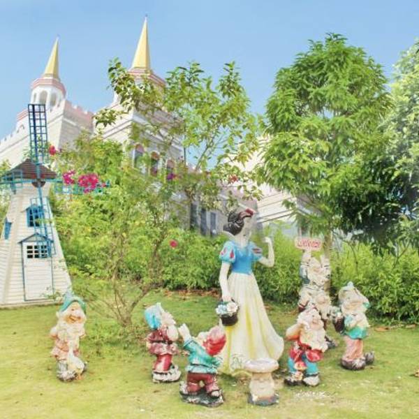 城堡后面有两条小路,往左边一直走可以看到白雪公主和小矮人,再一直走