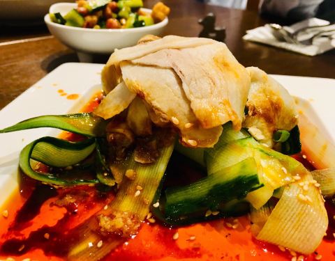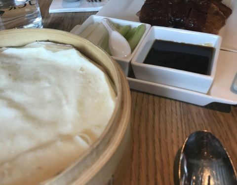 美中.鸭子是香港美心集团旗下的又一品牌,主做鸭子。但是,好像这家的菜式很有上海味、又有北京味。像开胃菜马兰头百页素千卷,这不就是典型的上海吃法么,还有小笼汤包,也是上海味的。当然重头戏就是北京烤鸭了,一样的配上沾酱、黄瓜青葱丝。不过片完后的鸭架子若是要做成汤,那得另点,不是附送的