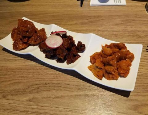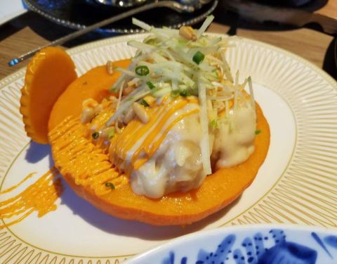 在香港吃到好的烤鸭不容易,好在海港城里面就有一家美中鸭子,走的是年轻的新派路线。有北京楼做后盾,烤鸭功夫是有相当的水准的。烤鸭是现点现烤,所以从点单到端上桌大概要40分钟左右,建议是坐下后立即就先点鸭子,然后再慢慢看其他的菜单。