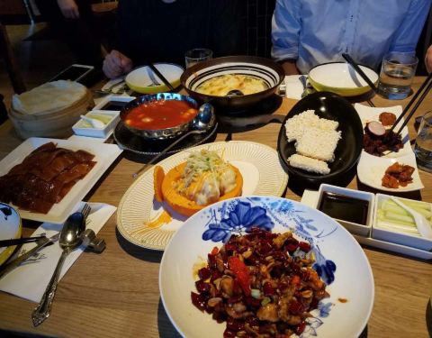 第一次来香港将军澳,美中鸭子位于这里几家连通的商场里。 [环境]西式咖啡厅的风格,有开放式明档橱窗,里面挂满了烤鸭,也有服务生在片皮摆盘的,但片鸭的手势和内地师傅比就差远了。 [服务]港式服务,因为是本地朋友带路,所以街里街坊的感觉,餐厅到了饭点也是人气火爆。 一行10人,几张桌拼成长形,点的也是10人的宴席套餐,套餐品种非常丰盛。 「片皮鸭」餐厅以片皮鸭为招牌,北京烤鸭做得挺地道,面皮、甜面酱、烤鸭都是那个味,只是没有一鸭几吃。 「宫爆鸡丁」在香港一定是改良版的,不是很辣,鸡很嫩。 「紫甘蓝鸡丝凉皮」这款凉菜非常可口,比传统的更加鲜美,麻酱鲜而不腻,以后必吃。 「蒜泥白肉」「口水鸡」同样是改良的,所以不是很地道的川味白肉,适合香港人口味。 「糖醋小排」上海的风味,只是没有那么甜。 「蟹黄虾球」这道菜应该是老外的至爱,不得不说香港美食在中西结合方面做得最好,虾的品质也相当好,蟹黄鲜香不腻。 「小炒鱼腩」美味啊,又是一道鬼佬喜爱的中式小炒。 「无锡灌汤小笼包」香港上海人多,所以上海菜都是妥妥的好吃。 「豆沙饼」「炒饭」「豆腐羹」品质都在线。