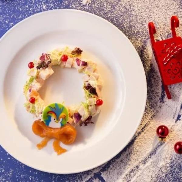 海龙王餐厅 玩了一整天,有点饿了。预定了超级有特色的海龙王餐厅圣诞晚餐。它就在海洋奇观水族馆旁。一边是400品种,5000条鱼,13米的巨型观赏屏,一边享受圣诞饕餮大餐!实在是太畅快!别看此时我们面对镜头还是一脸正经,下一秒就再也抵挡不住高颜值美食的诱惑,大快朵颐起来。应景地点了两个圣诞套餐。 圣诞晚餐 前菜是烟火鸡鲜虾沙律伴烟鲑鱼, 摆盘很像是圣诞彩环,真的漂亮到不舍得吃!汤是青豆蓉汤伴烟熏猪肉肠, 模仿下着雪的小屋,可以说是相当用心了。主菜: 栗子烧火鸡配龙虾 香草烧牛柳配龙虾 从摆盘到口味,都是一流甜品:朱古力芭菲伴云呢拿雪糕, 女儿最喜欢这个了,红顶小屋炒鸡可爱!圣诞儿童套餐 模仿海洋列车的造型,薯格配炸鸡宝,烟火鸡蘑菇意大利粉配菠菜忌廉汁,时令蔬菜。甜点是牛油干果蛋糕, 还有闪光果汁,可爱又营养的说。