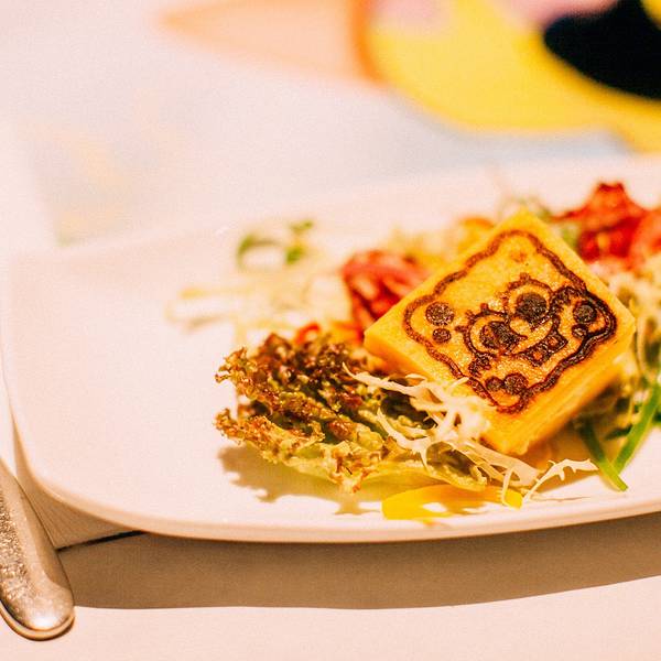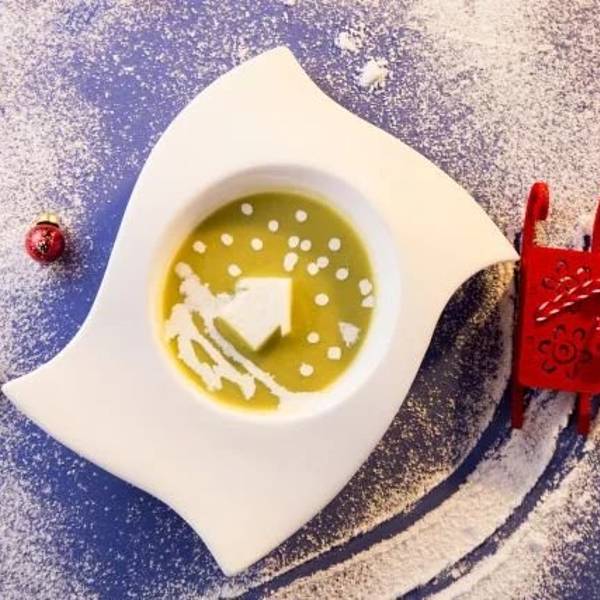 摆盘很像是圣诞彩环,真的漂亮到不舍得吃!汤是青豆蓉汤伴烟熏猪肉肠,