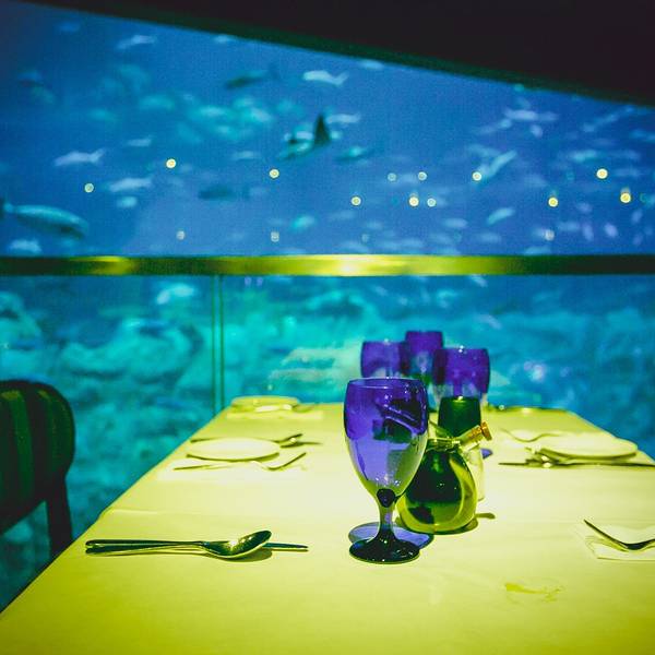 全香港唯一的水族馆餐厅。顾客可坐在最大的观鱼屏幕前用餐,一边观赏最奇特的海洋奇观,一边享用美食。淡蓝的海水映照在餐桌上,浪漫到极致,非常适合情侣用餐以及亲自出游哦。