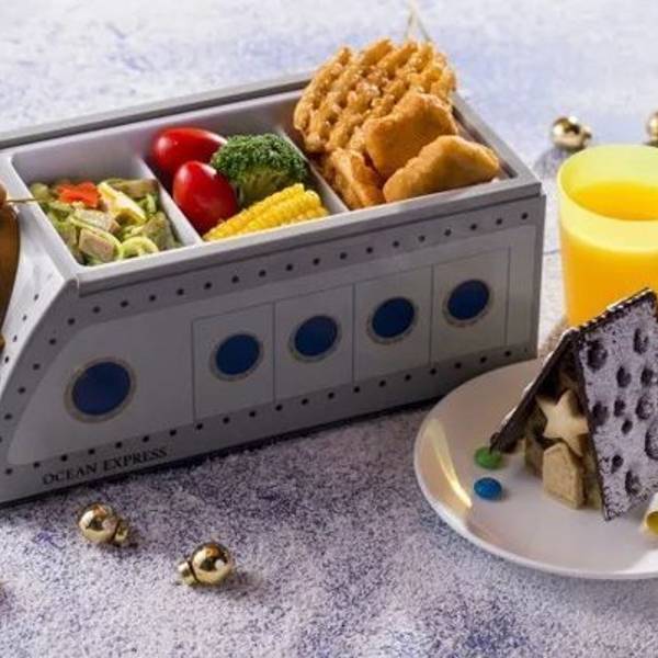 模仿海洋列车的造型,薯格配炸鸡宝,烟火鸡蘑菇意大利粉配菠菜忌廉汁,时令蔬菜。甜点是牛油干果蛋糕, 还有闪光果汁,可爱又营养的说。