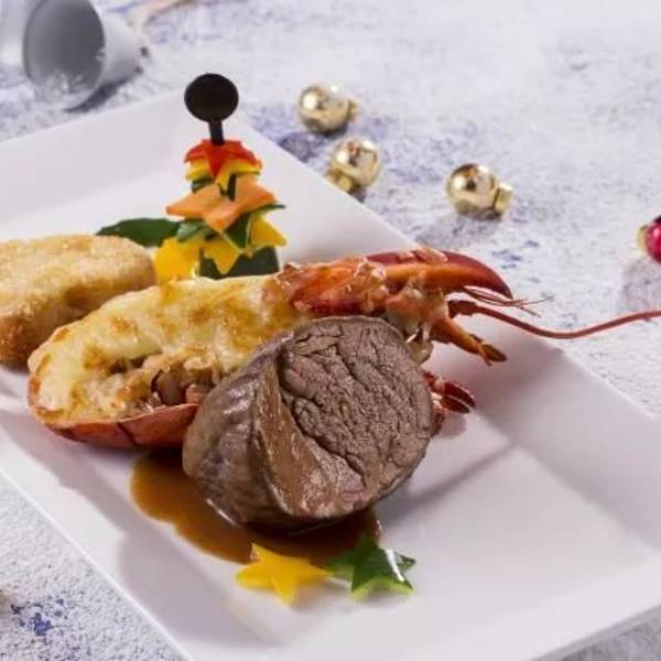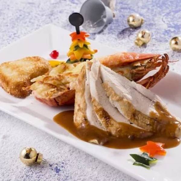 模仿下着雪的小屋,可以说是相当用心了。主菜: 栗子烧火鸡配龙虾
