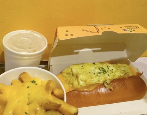 之前朋友介绍过的热狗店Iconic H,两个人点了一个四层地狱芝士热狗加黑松露炒蛋,加钱变套餐有薯条和饮料,再加12块薯条可以加热熔芝士。芝士真的超级拉丝,蛋炒得很嫩,一起吃口感蛮丰富的,然后薯条一定要趁热吃!