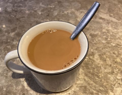 信德中心手扶梯的旁边是美心的这一家Deli-O,手扶梯的另外一边是美心MX,旁边还有美心西饼,都是美心家族的成员,这样也方便管理。这一家算是轻食餐厅,一份早餐烧汁香草猪肉肠+煎蛋+多士+饮料,只要38块钱,营养全面,味道也好,最喜欢的是装奶茶的杯子,小搪瓷杯很可爱,好像小时候刷牙的杯子一样。