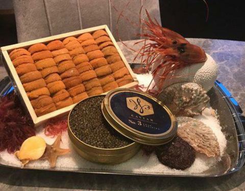 - ...蛋仔的味道接着下来点好了菜后 ,侍应便 捧上了一大盆海胆和鱼子酱 用来介绍给我们他将会用的食材