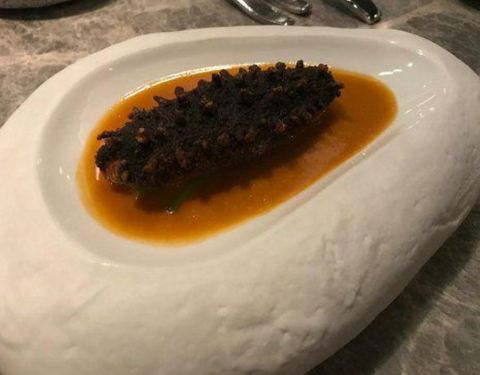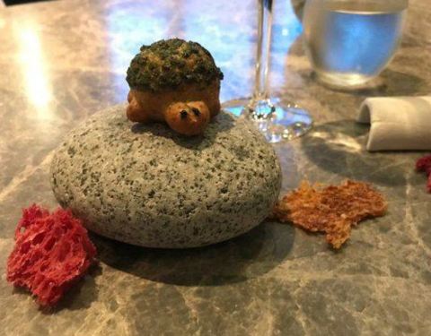 刚坐下时,便发现餐桌上的摆设就好像坐在海滩上,一只可爱小龟背上长上了青苔,经侍应介绍下原来整只小龟是可以吃的! 小海龟就好像我们吃的鸡蛋仔的味道接着下来点好了菜后 ,侍应便 捧上了一大盆海胆和鱼子酱 用...刚坐下时,便发现餐桌上的摆设就好像坐在海滩上,一只可爱小龟背上长上了青苔,经侍应介绍下原来整只小龟是可以吃的! 小海龟就好像我们吃的鸡蛋仔的味道接着下来点好了菜后 ,侍应便 捧上了一大盆海胆和鱼子酱 用来介绍给我们他将会用的食材。菜式一般都包含了东方和西方的元素就例如 ;海胆大虾意粉 就包含了 中国 (芡汁 )日本 (海胆 牡丹虾 )欧洲 (意大利粉 )的元素, 混合得来又不会有生硬 做作 的感觉。